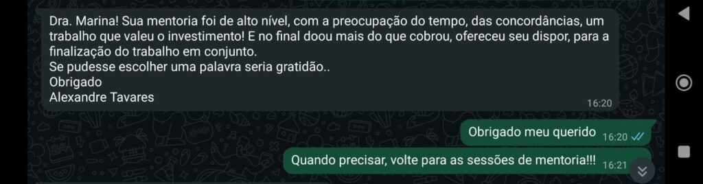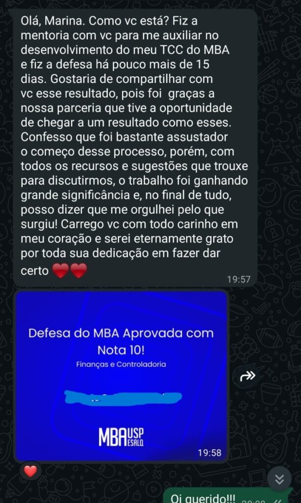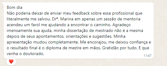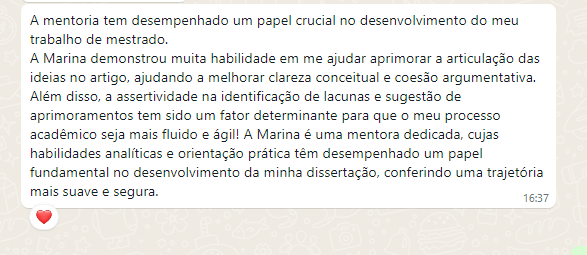 Importante: Você receberá todo o direcionamento, leitura crítica e apoio necessários para concluir seu objetivo acadêmico com excelência. Entretanto, a escrita e a formatação do trabalho são de sua responsabilidade, eu te guio, mas não executo por você.