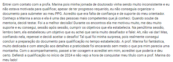 Muitos mentorados escolhem seguir comigo para novos desafios, como escrita de um artigo, o início de um mestrado, a defesa de uma dissertação ou a publicação científica.